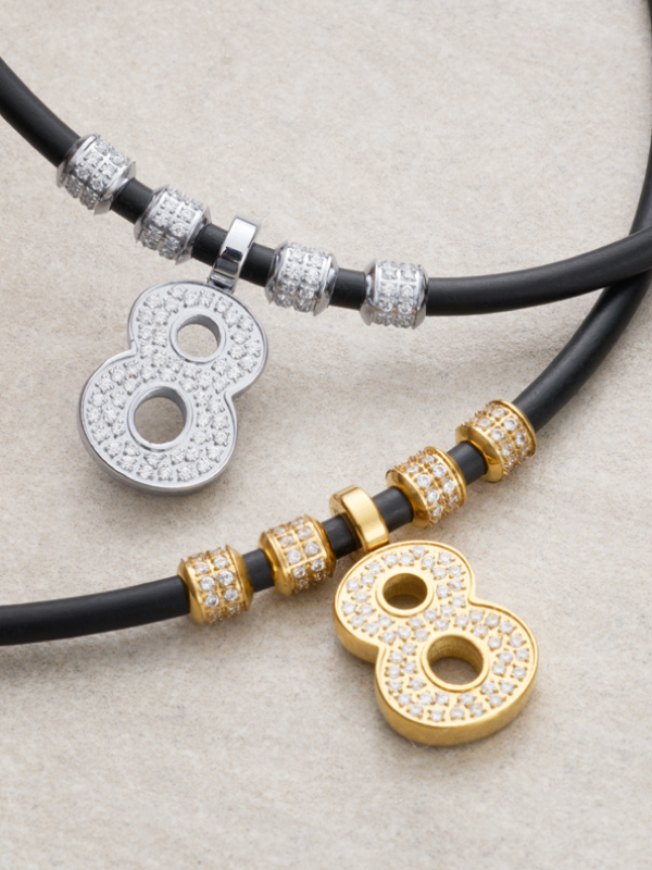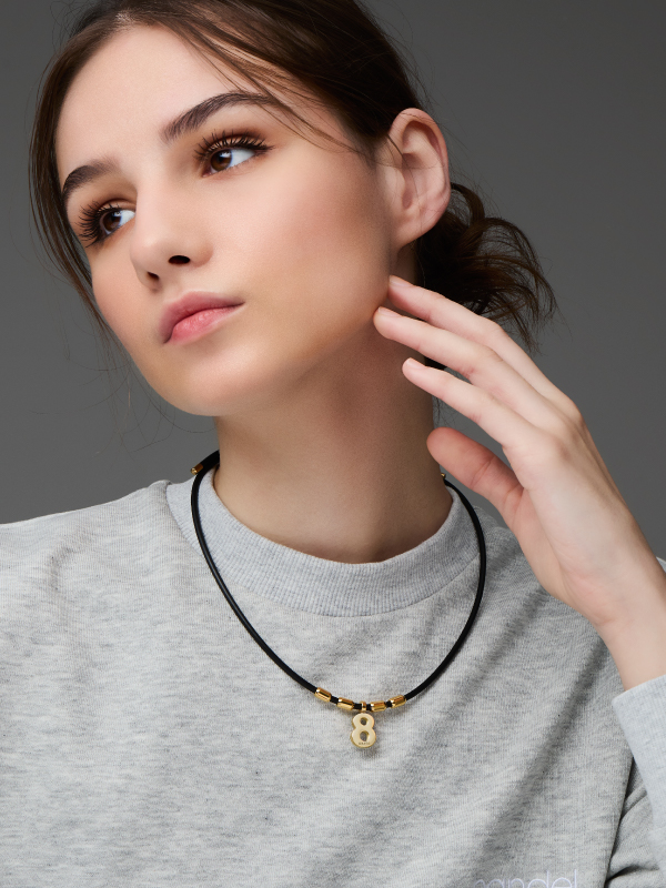 BANDEL×muta Healthcare Necklace Eightのヘッドはmutaの代表的なモチーフである「No.8」をイメージ。ムータが発信する「No.8」は「無限大に変化する」という意味を持ち、2面性が混じり合うムータプロダクトの特徴的クリエーションを表現したアイコンです。